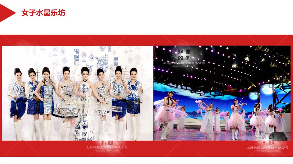 《女子水晶樂坊》是中國本土著名民族文化節目,她們是中國新一代的民族符號,在器樂界傲居一線位置的新民樂團隊!上海女子水晶樂坊留下了亮麗的身影和留戀的掌聲,把中國的古典與時尚創新和傳承到了精妙之處,用音樂的語言與世界各國人民進行文化交流,增進了友誼,同時為祖國的當代形象做成了最美的一張名片!